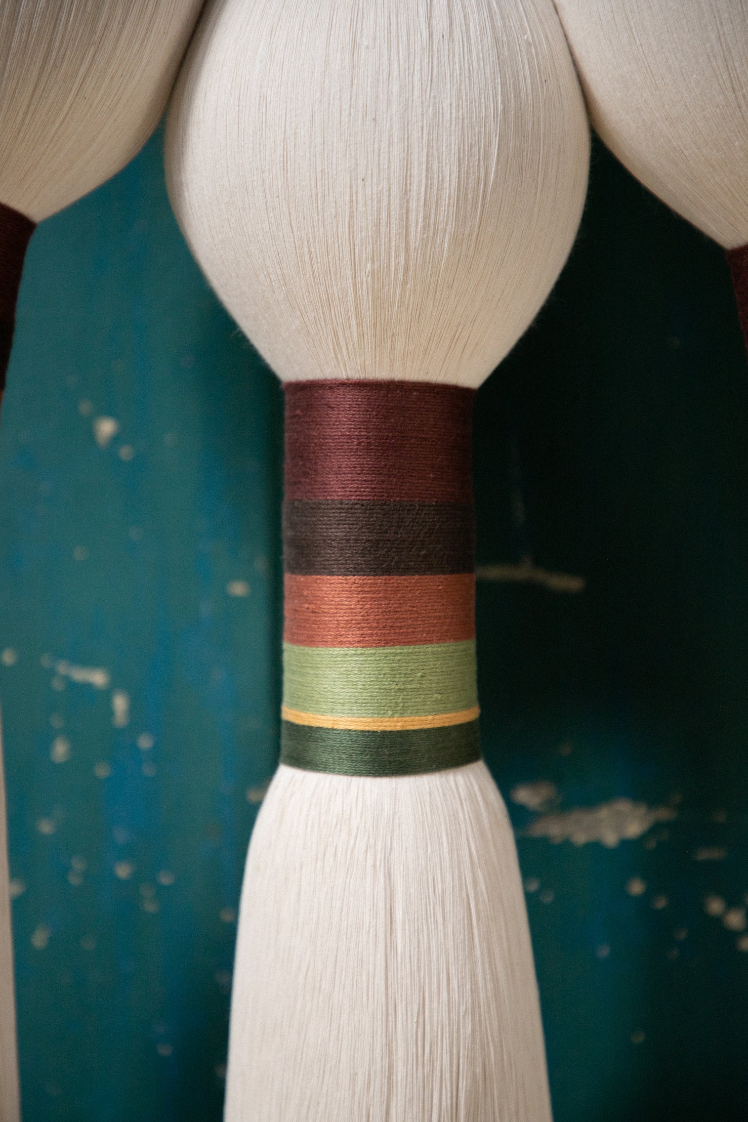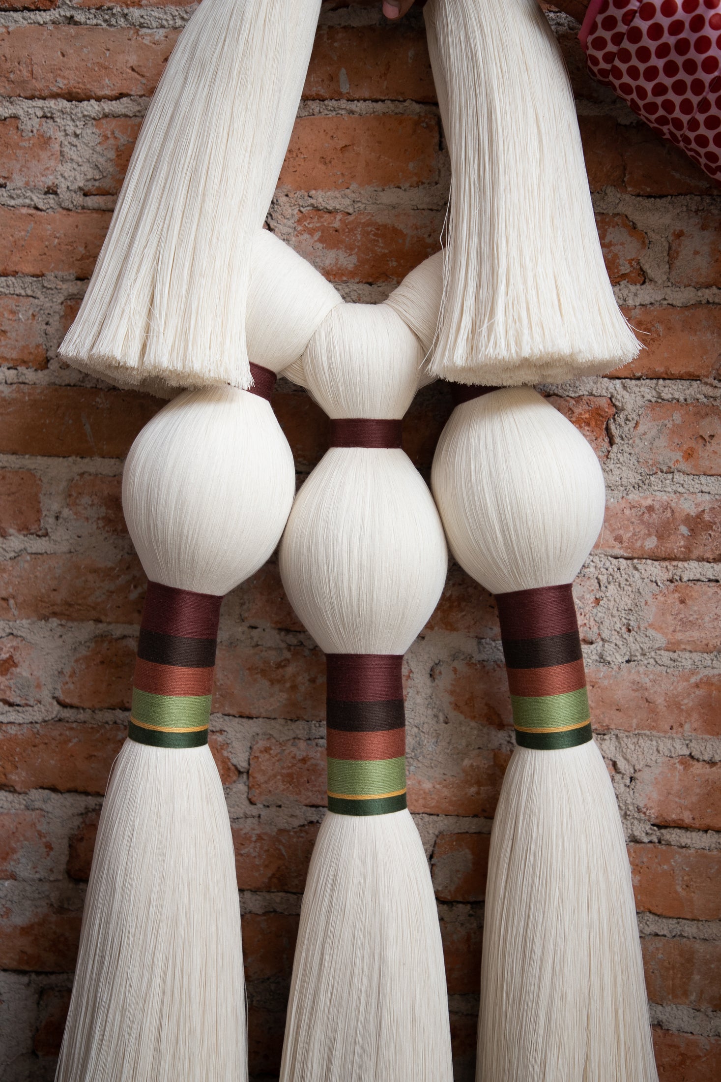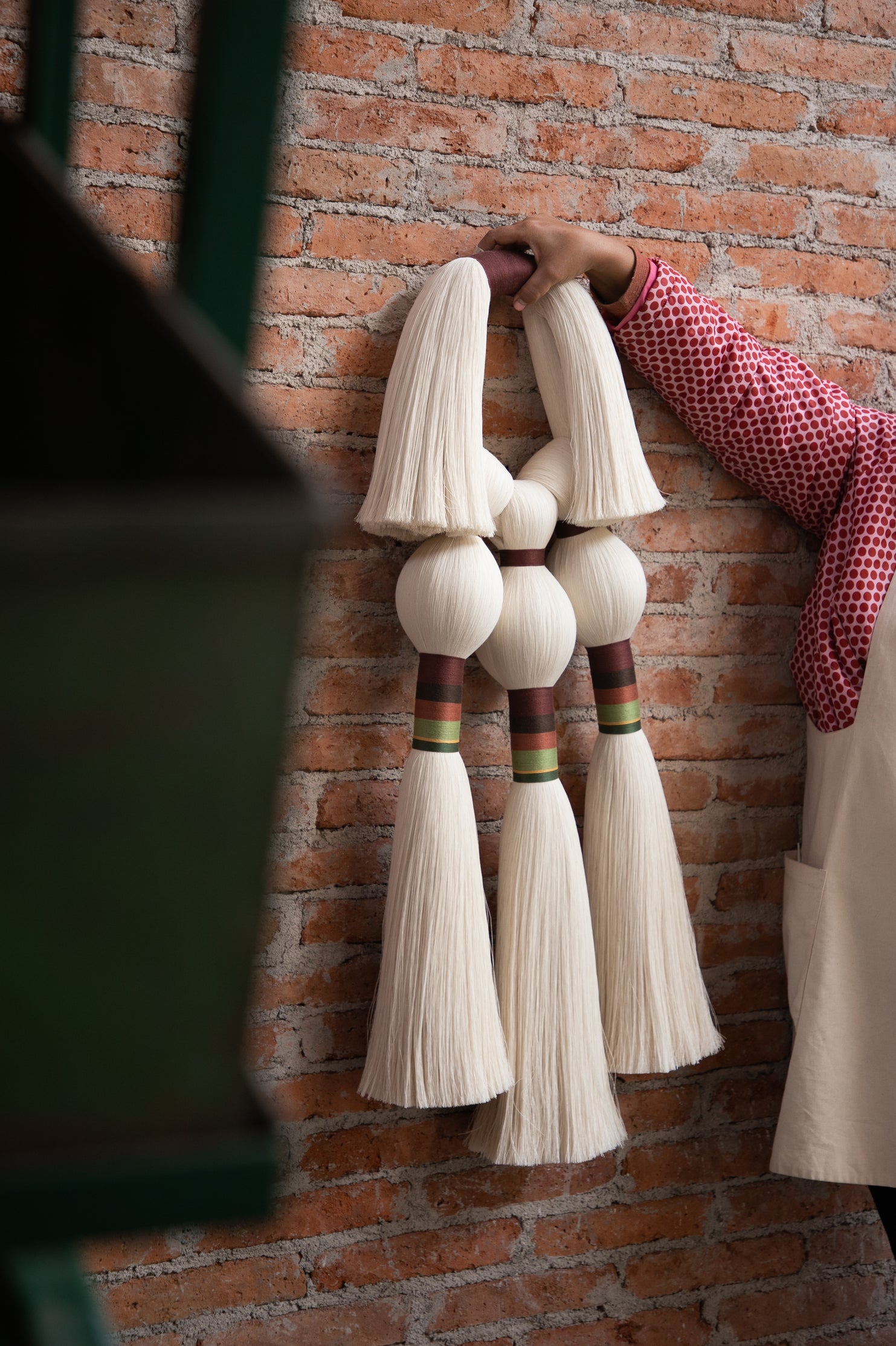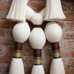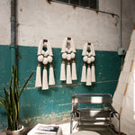 Este es un acento decorativo surgido de la evolución natural que experimentaron nuestras piezas de joyería a formatos más grandes. Una mezcla de técnicas artesanales que involucra a nuestro clásico cordón (implementado para elaborar collares y pulseras), del cual se desprenden dos pompones recortados hacia los laterales, y tres amarres sencillos hacia abajo, que dan pie a las tres brujas representadas con borlas, amarres largos embarrilados y mechones recortados. Esta es nuestra versión del Aquelarre que, al igual que el de Goya, está hecho para atemorizar con su sencillez y belleza los muros de nuestros espacios favoritos. Por cierto, podemos pedir sólo un Tres brujitas, o también tres Tres brujitas, dependiendo de cuántas queramos ver volando en nuestro aquelarre.
