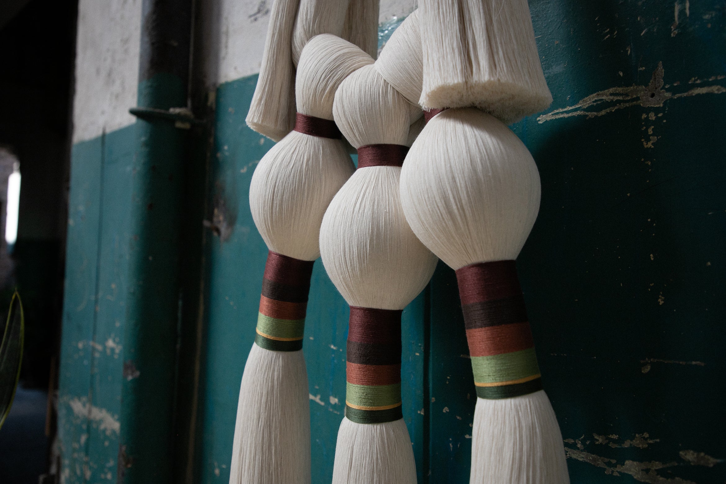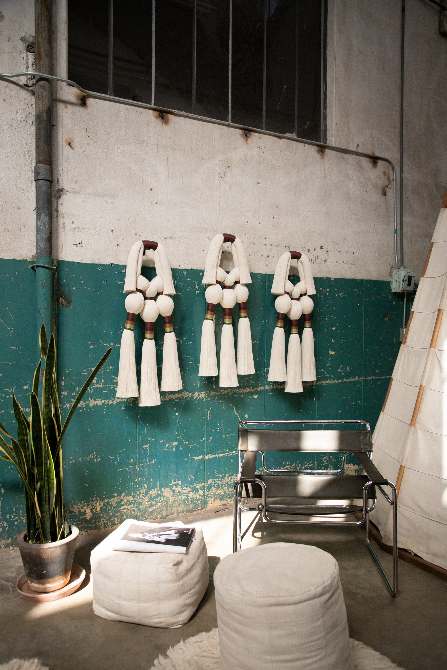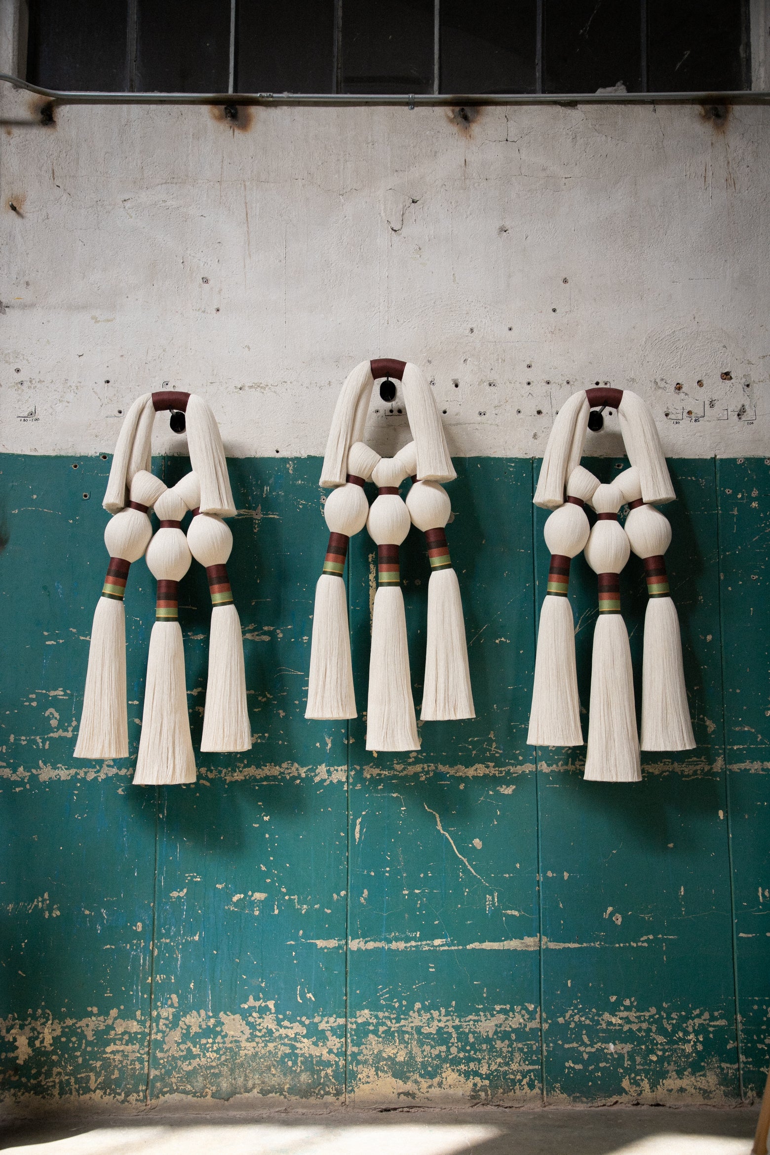 Este es un acento decorativo surgido de la evolución natural que experimentaron nuestras piezas de joyería a formatos más grandes. Una mezcla de técnicas artesanales que involucra a nuestro clásico cordón (implementado para elaborar collares y pulseras), del cual se desprenden dos pompones recortados hacia los laterales, y tres amarres sencillos hacia abajo, que dan pie a las tres brujas representadas con borlas, amarres largos embarrilados y mechones recortados. Esta es nuestra versión del Aquelarre que, al igual que el de Goya, está hecho para atemorizar con su sencillez y belleza los muros de nuestros espacios favoritos. Por cierto, podemos pedir sólo un Tres brujitas, o también tres Tres brujitas, dependiendo de cuántas queramos ver volando en nuestro aquelarre.