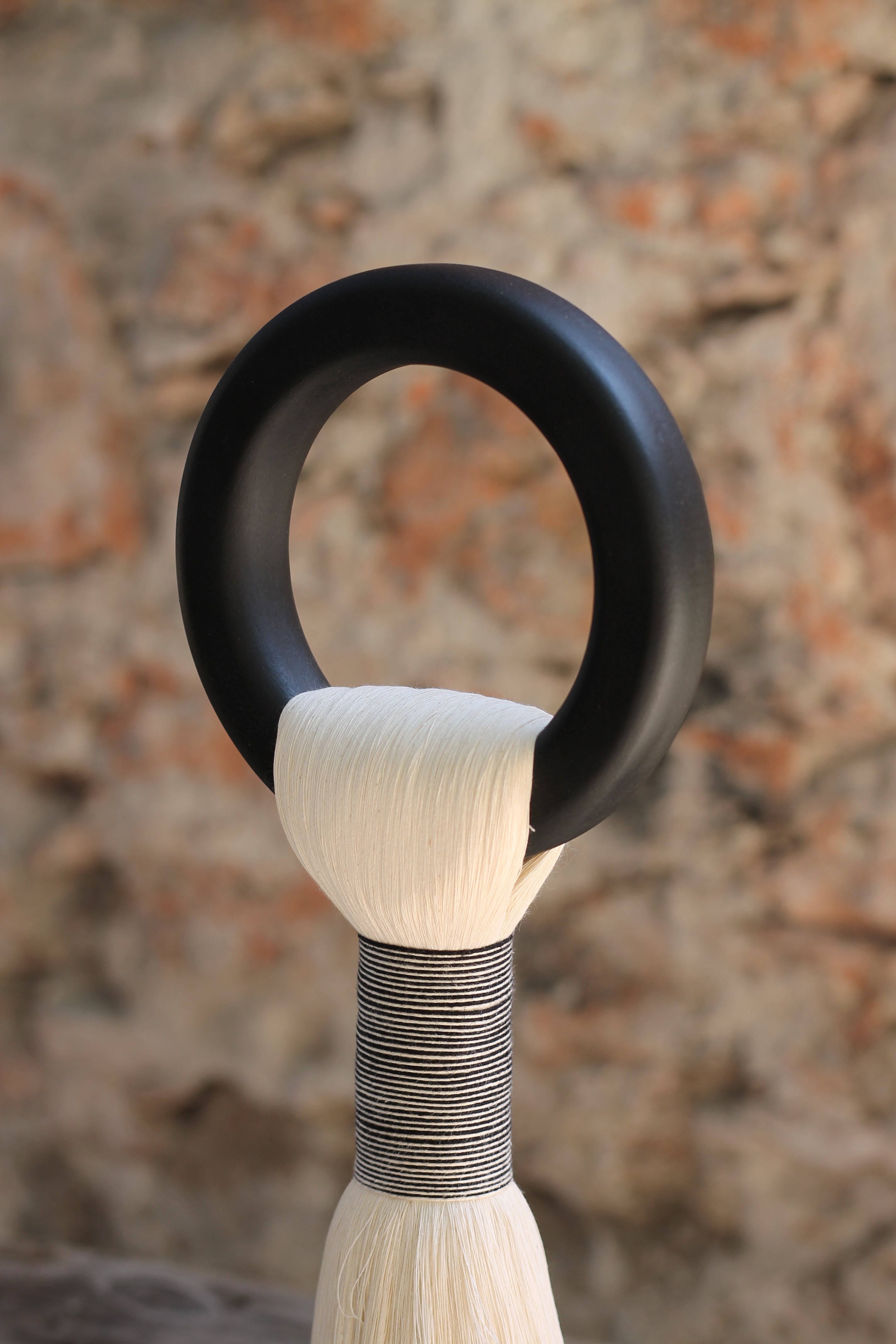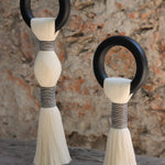 Esta pieza conserva la esencia de nuestro Danzante Doble, pero con bailarines hechos de hilo de algodón crudo vistiendo “atuendos” deslumbrantes y expresivos en amarres de hilaza que contrastan o combinan colores, formas y texturas, dándole a este acento decorativo la sobriedad y elegancia, o la alegría y festividad propias de la pareja en una gran sala de baile. Una pieza hecha totalmente a mano por artesanos en el taller ubicado en Hércules, Querétaro.