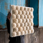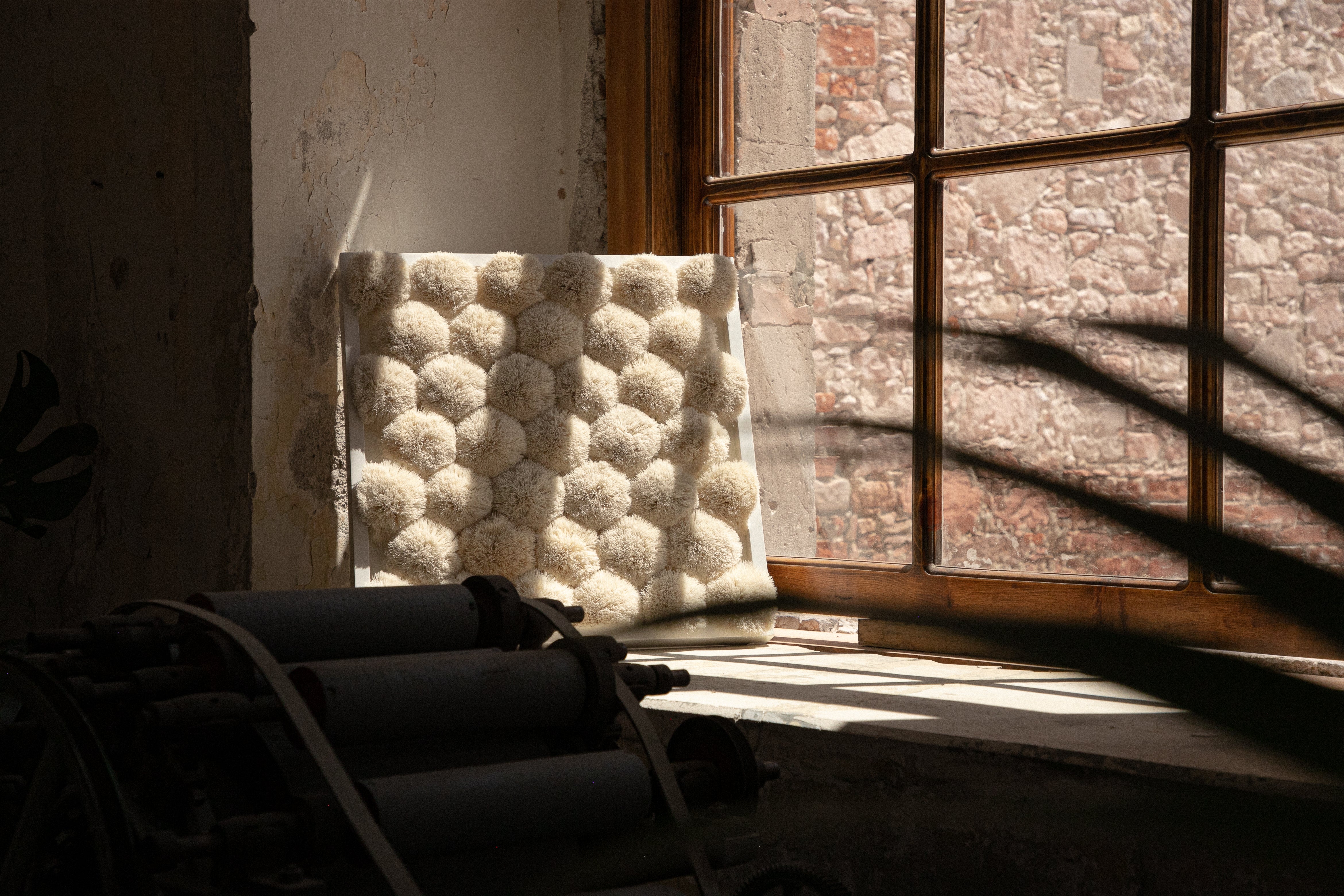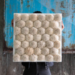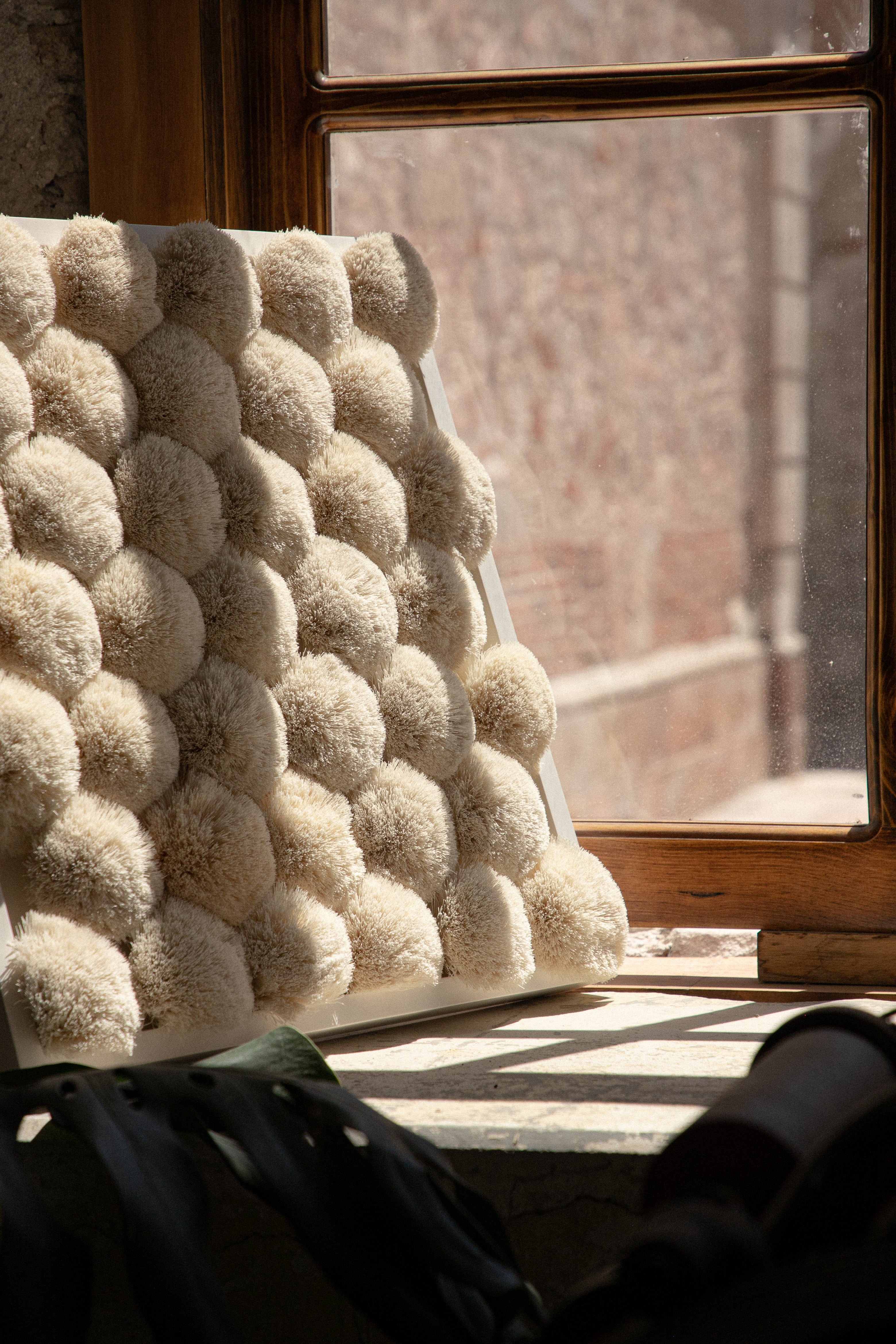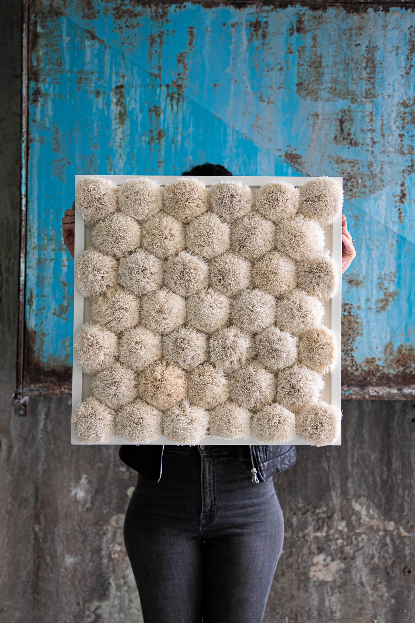 Los Floretes son un acento decorativo de mesa o colgante de pared, resultado de explorar el diseño de nuevas piezas hechas con los remanentes de hilo de algodón de nuestra técnica Recuperado. Para su creación, retomamos el patrón de celdas característico de nuestros Grandes Formatos “Colmena”, pero con un diseño desenfadado, colocando ramilletes o manojos de hilo de algodón crudo en un soporte de madera enmarcado.