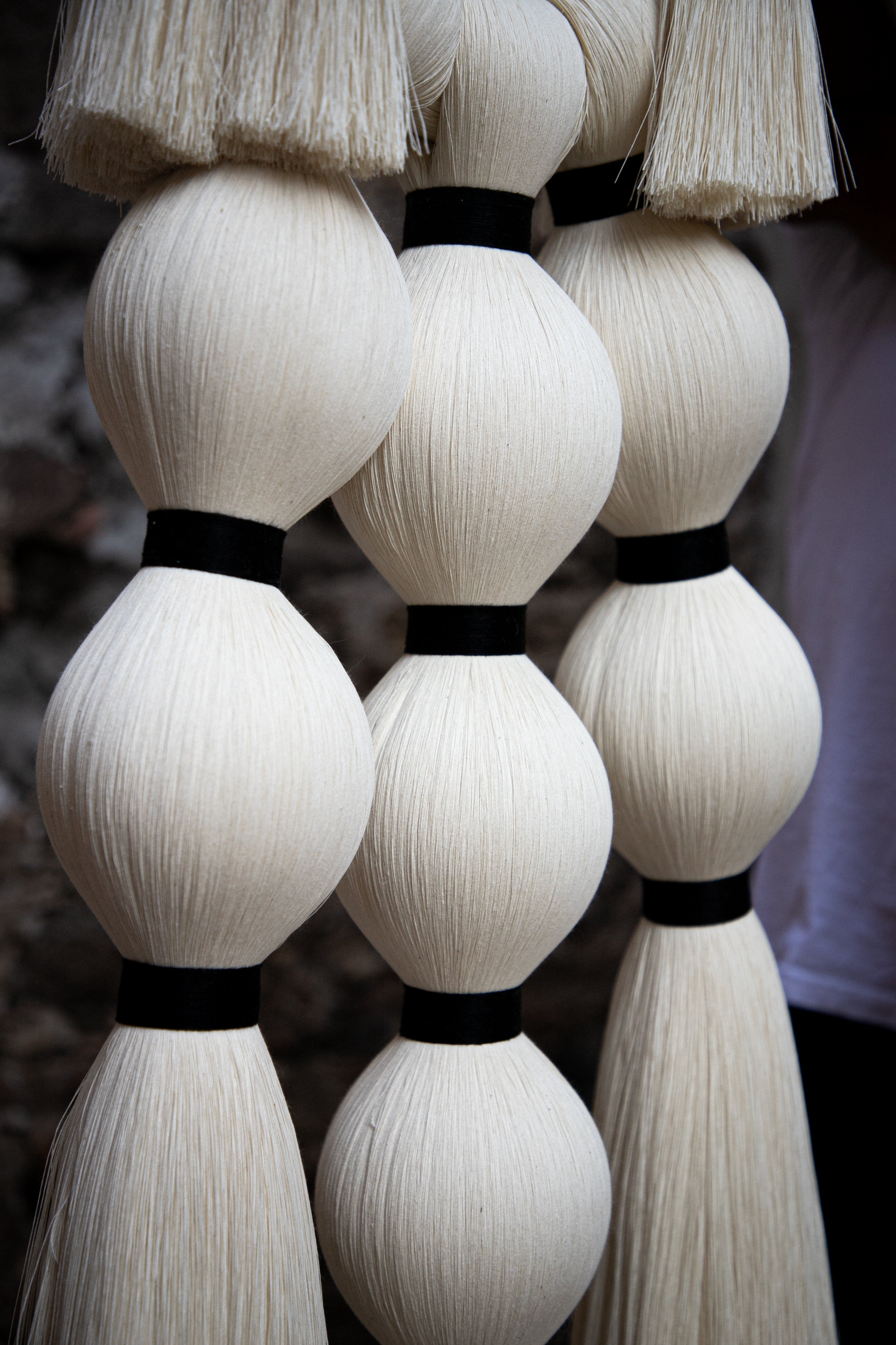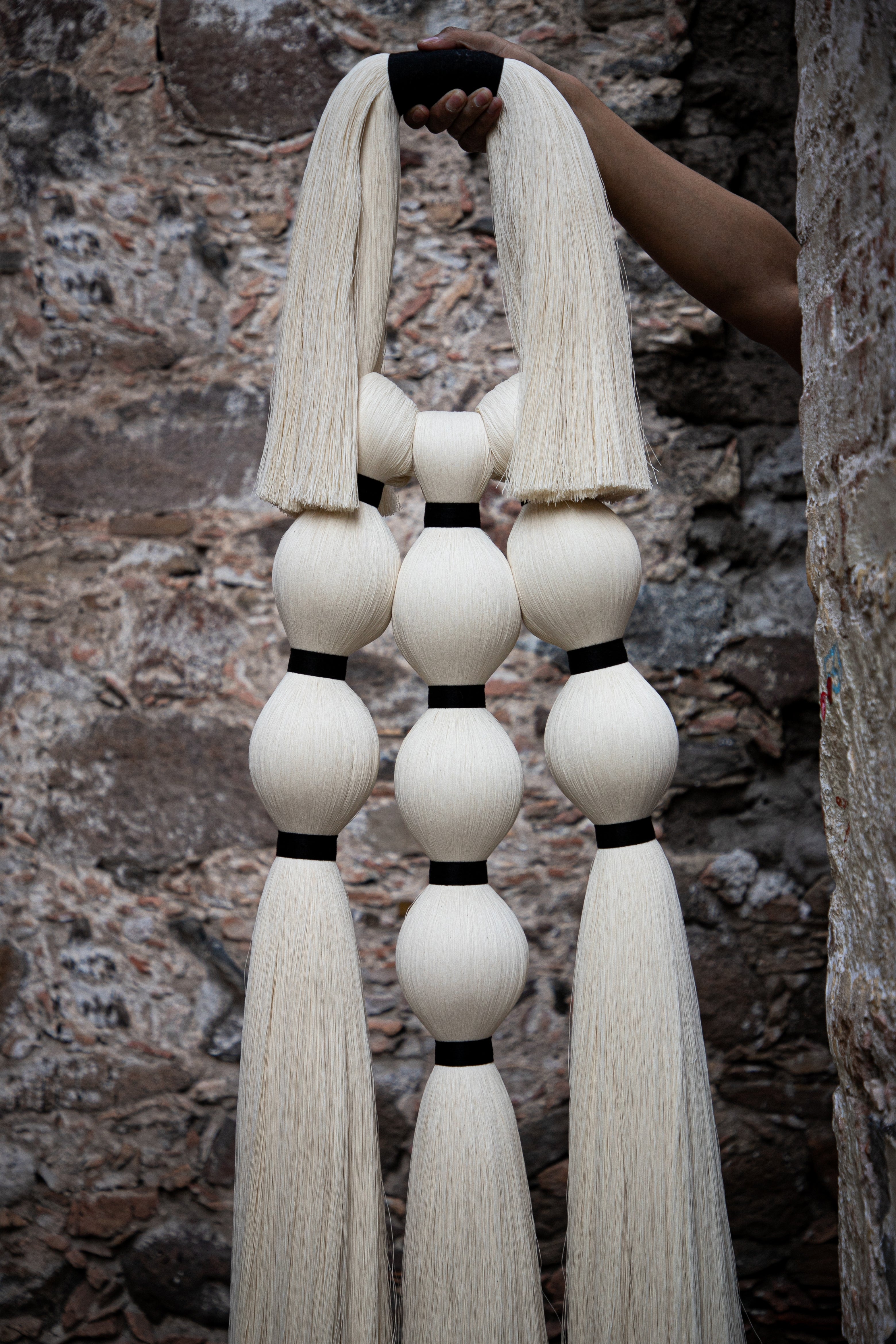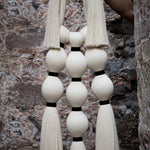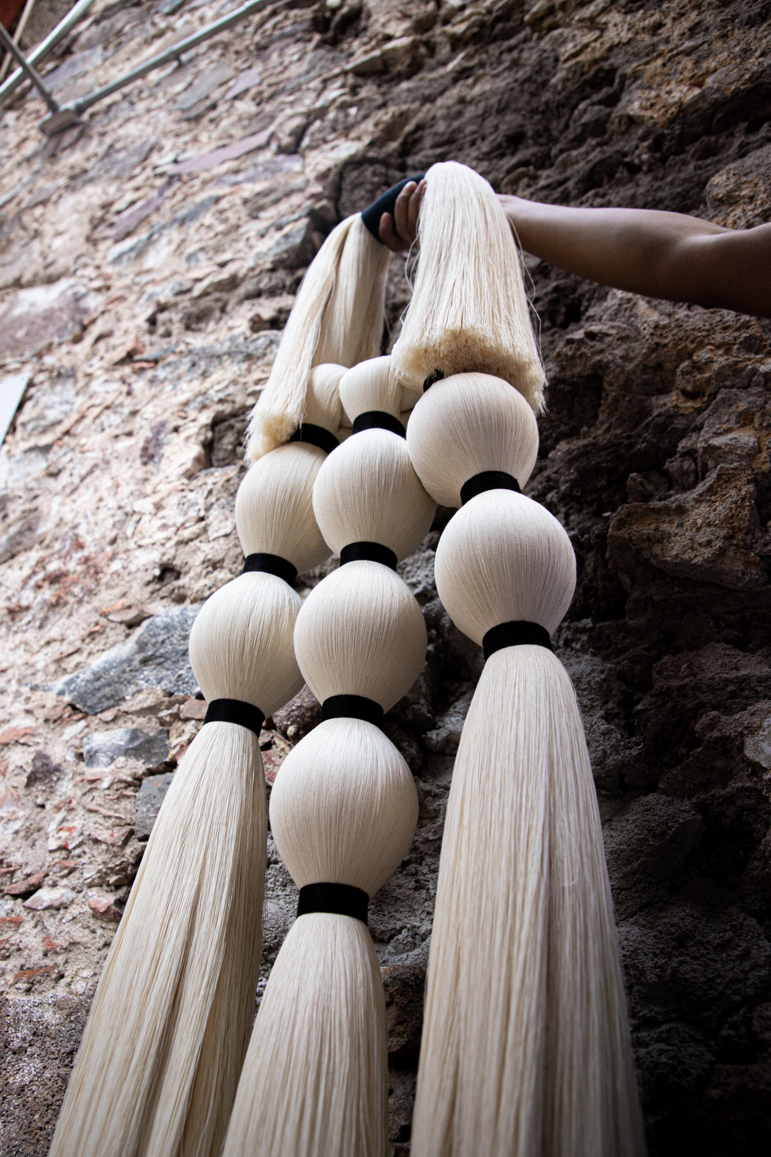 Retomamos la inspiración de las tradicionales historias sobre brujas que habitan en todos los rincones de México y el mundo, desde aquellas que deambulan solitarias, hasta las que se congregan en las Noches. Tres piezas colgantes para pared representan la evolución de nuestra joyería a un formato mayor; en ellas apreciamos el círculo de fuego en la parte superior, formado por nuestro clásico cordón de algodón, y las avivadas llamas como pompones a los lados. Abajo, las cabezas de las brujas, una solitaria, o tres o siete en reunión para el ritual, como borlas y amarres cortos de hilaza entintada; todas ellas flotando en el aire, tal y como lo revelan sus faldones en caída a modo de mechones recortados.