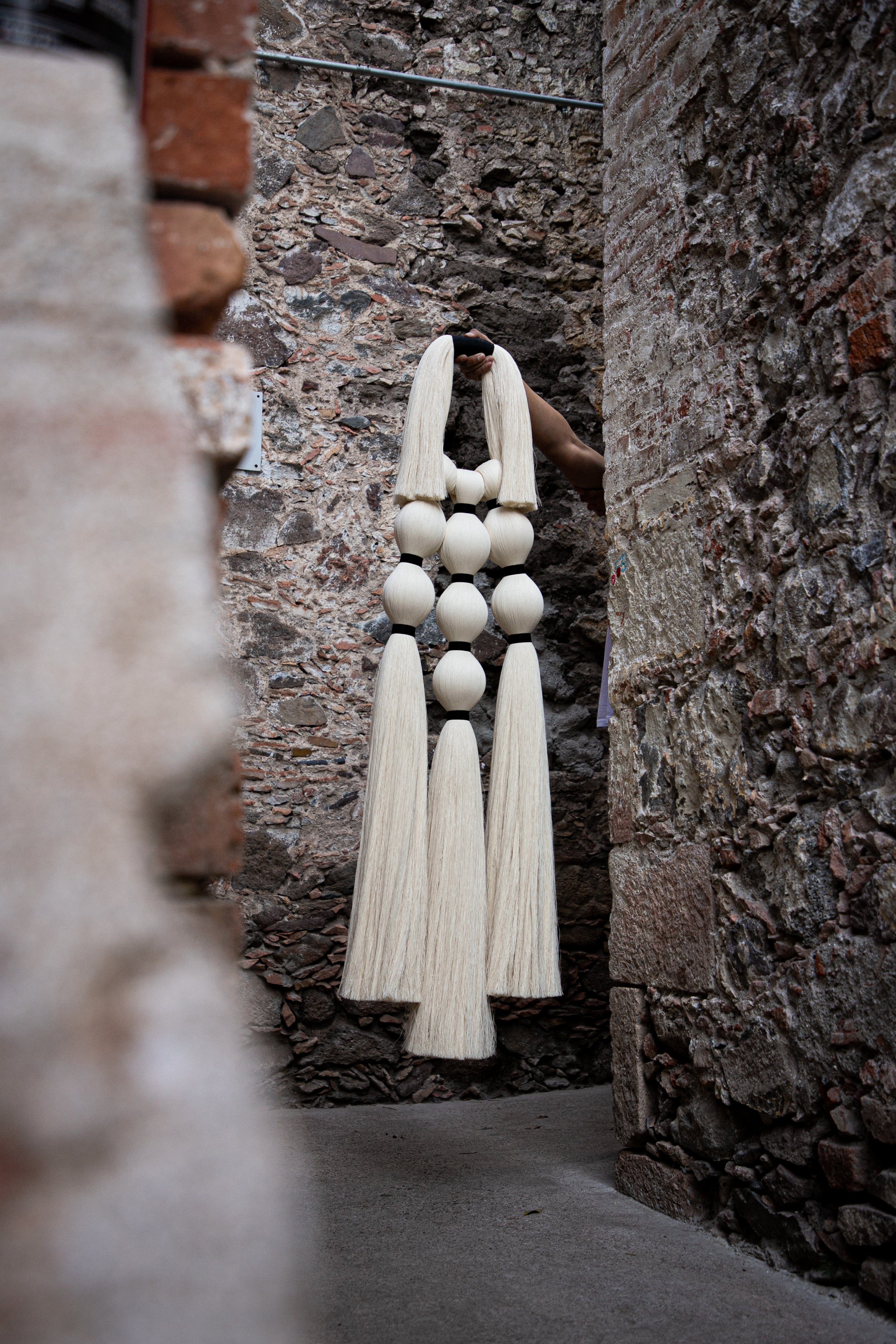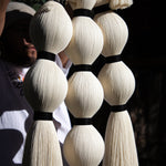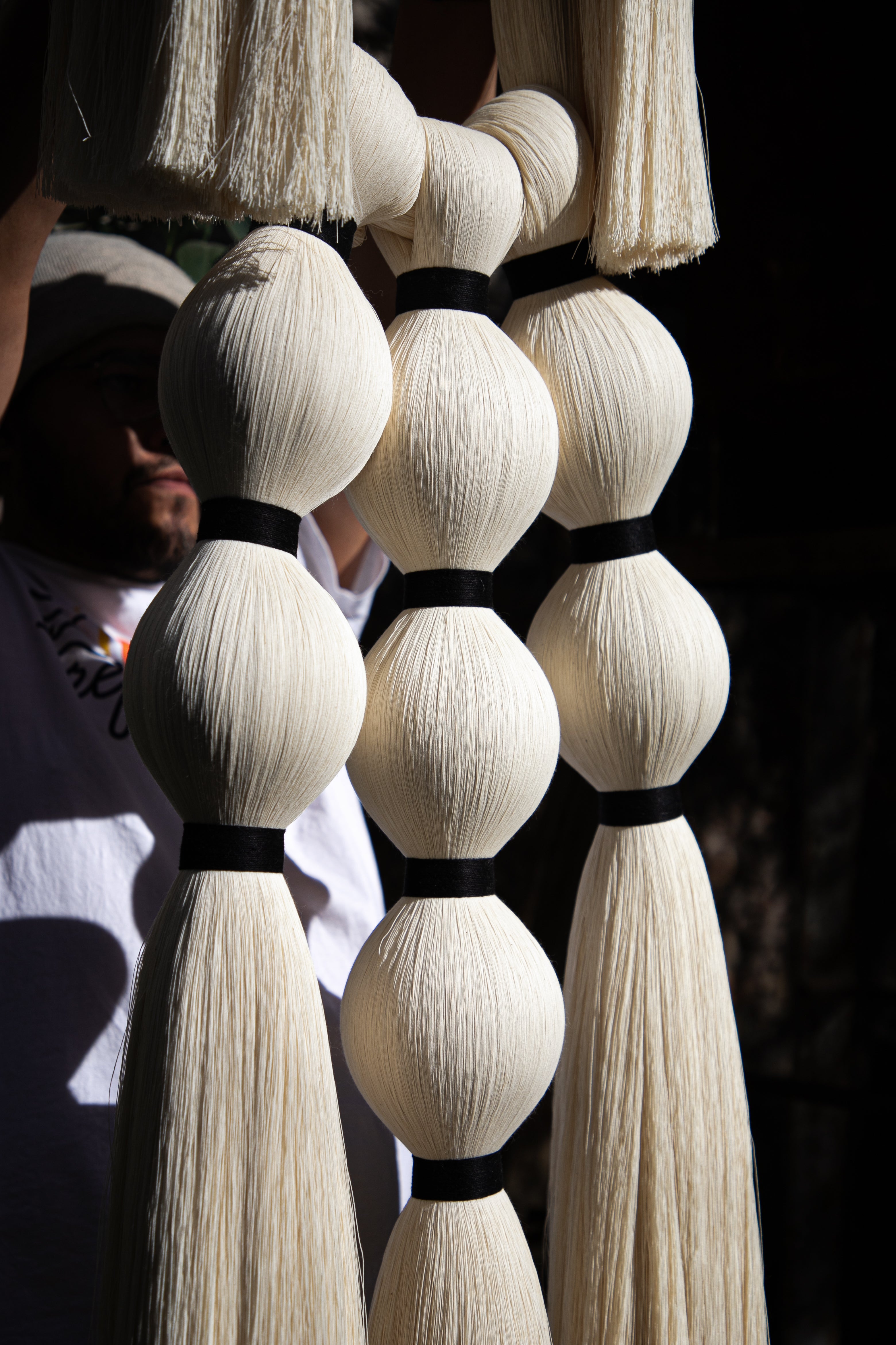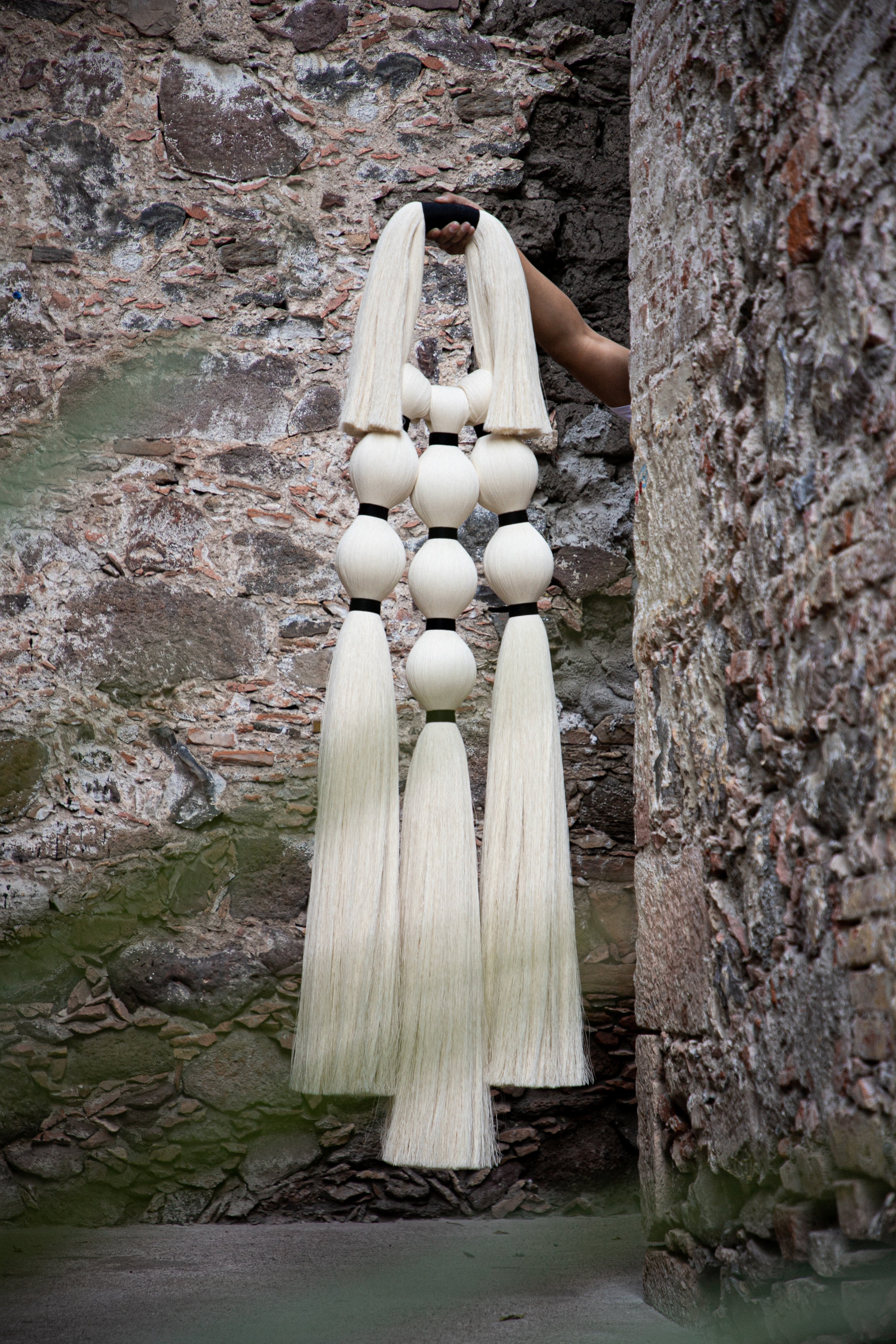 Retomamos la inspiración de las tradicionales historias sobre brujas que habitan en todos los rincones de México y el mundo, desde aquellas que deambulan solitarias, hasta las que se congregan en las Noches. Tres piezas colgantes para pared representan la evolución de nuestra joyería a un formato mayor; en ellas apreciamos el círculo de fuego en la parte superior, formado por nuestro clásico cordón de algodón, y las avivadas llamas como pompones a los lados. Abajo, las cabezas de las brujas, una solitaria, o tres o siete en reunión para el ritual, como borlas y amarres cortos de hilaza entintada; todas ellas flotando en el aire, tal y como lo revelan sus faldones en caída a modo de mechones recortados.