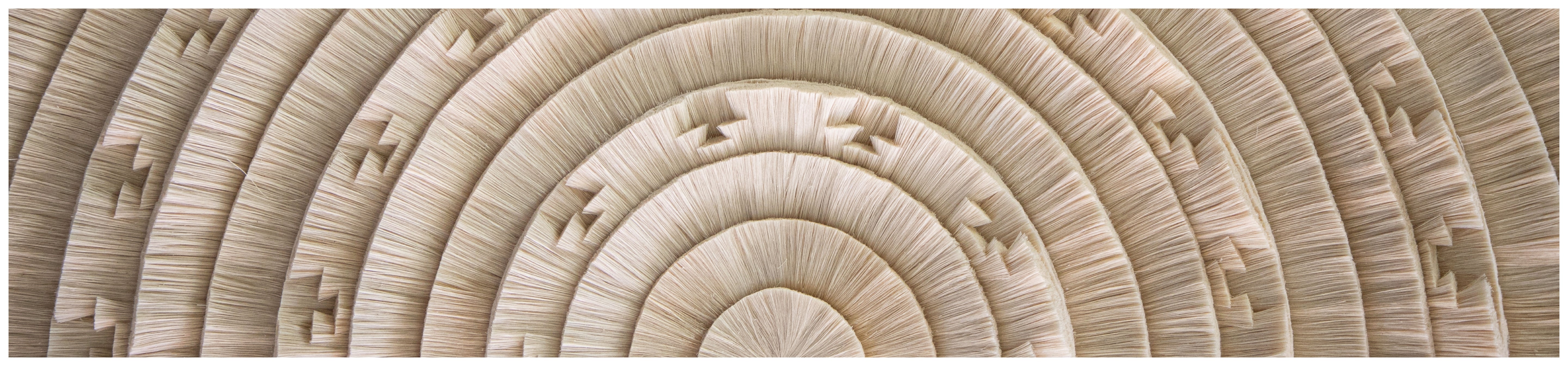 In honor of the Sun Stone, also known as the Aztec Calendar, this tapestry encapsulates the concept of time created by the ancient civilization and empire that inhabited the Valley of Mexico until the arrival of the Spanish invaders. It is composed of concentric circular sections made of cotton horsehair that represent the various aspects of their understanding of earthly and spiritual existence in relation to the ruling deities of the universe, abstracting the different levels and elements that comprise it.