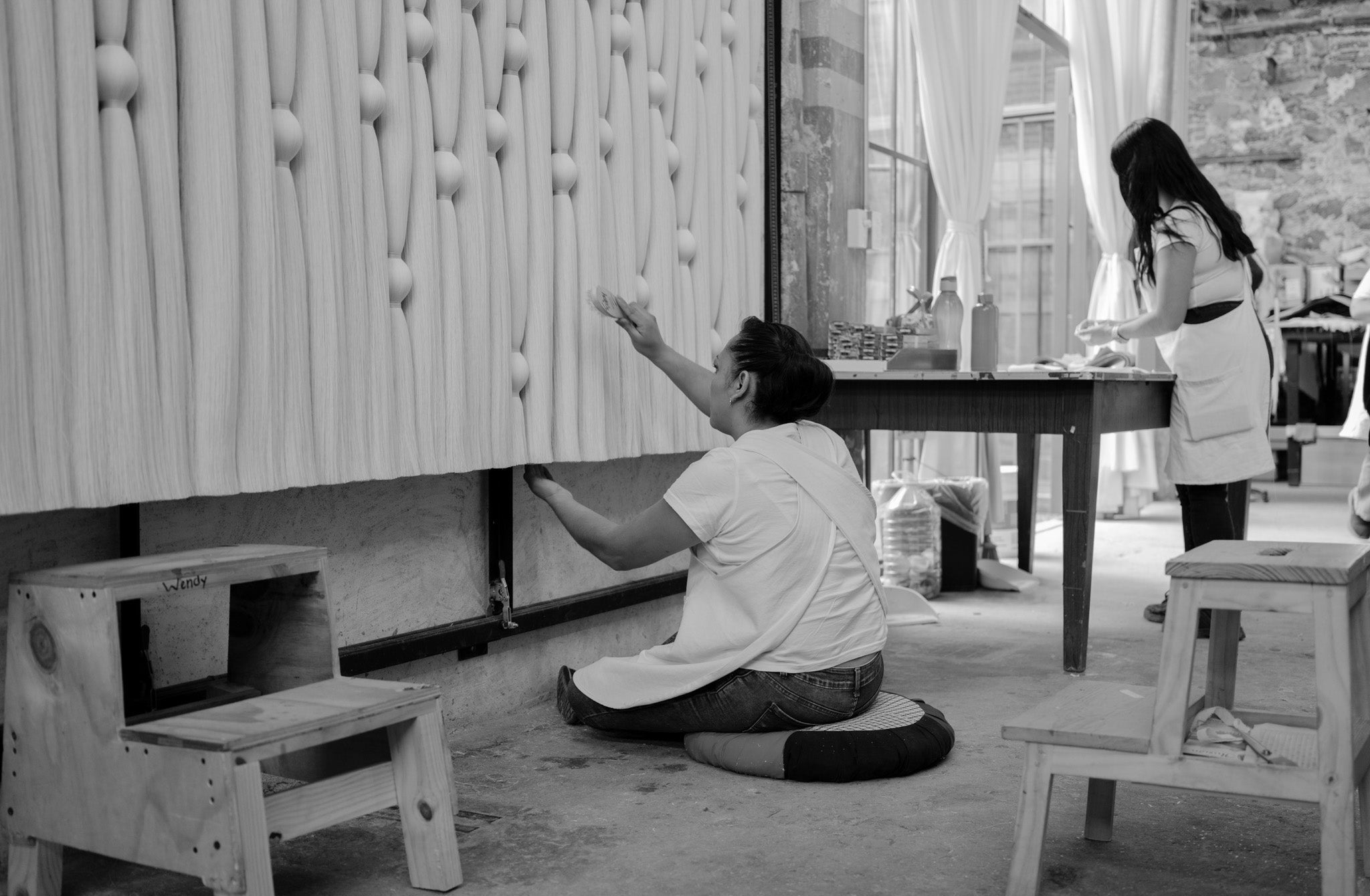 En el mismo espacio trabajan nuestros equipos de diseño, proyectos, comunicación y logística, haciendo posible cada colección. Al fondo, el taller da vida a todas nuestras piezas. Está dividido en áreas especializadas para trabajar piezas de hasta 7 metros, organizadas según las técnicas artesanales que aplicamos, como el embarrilado, la costura y el peinado.