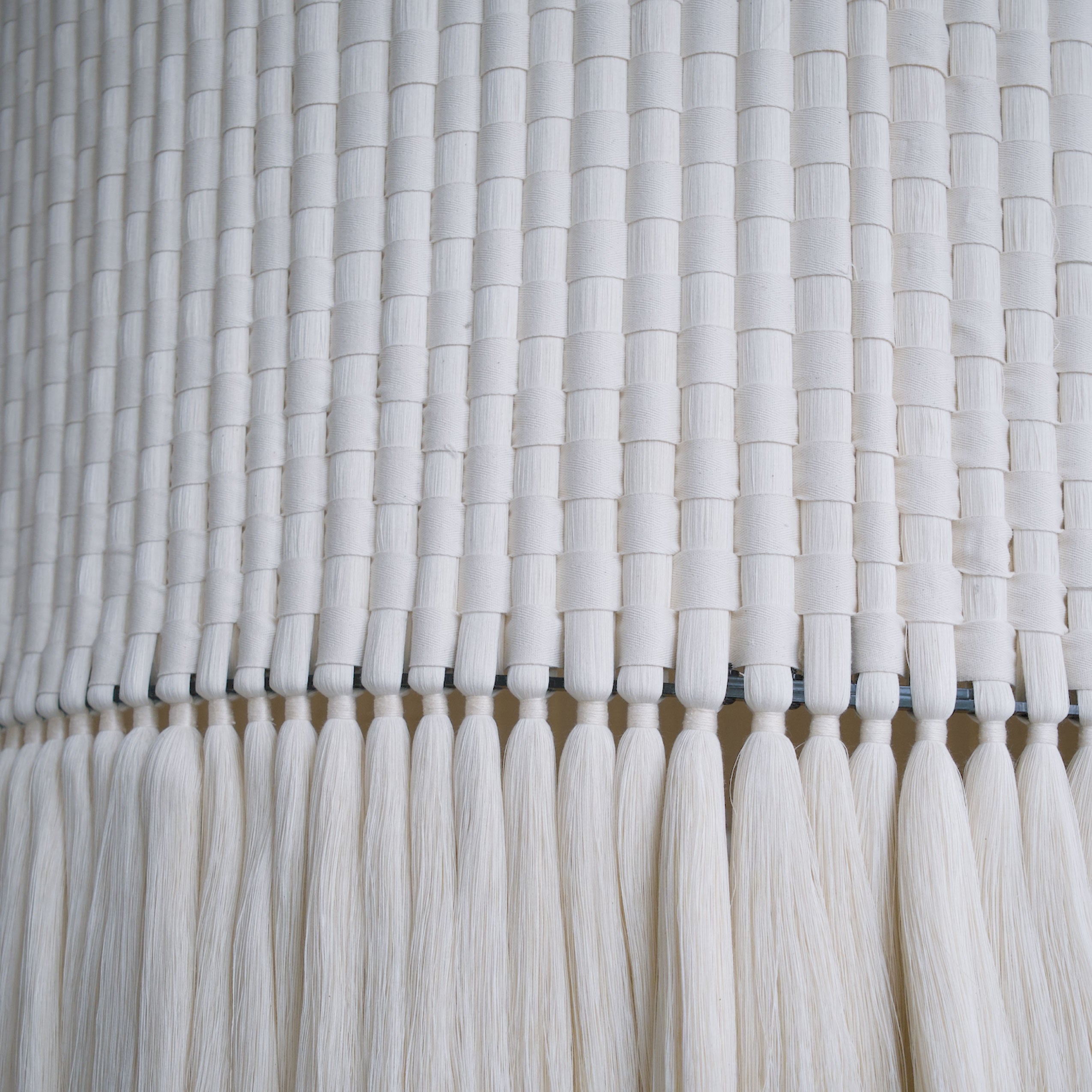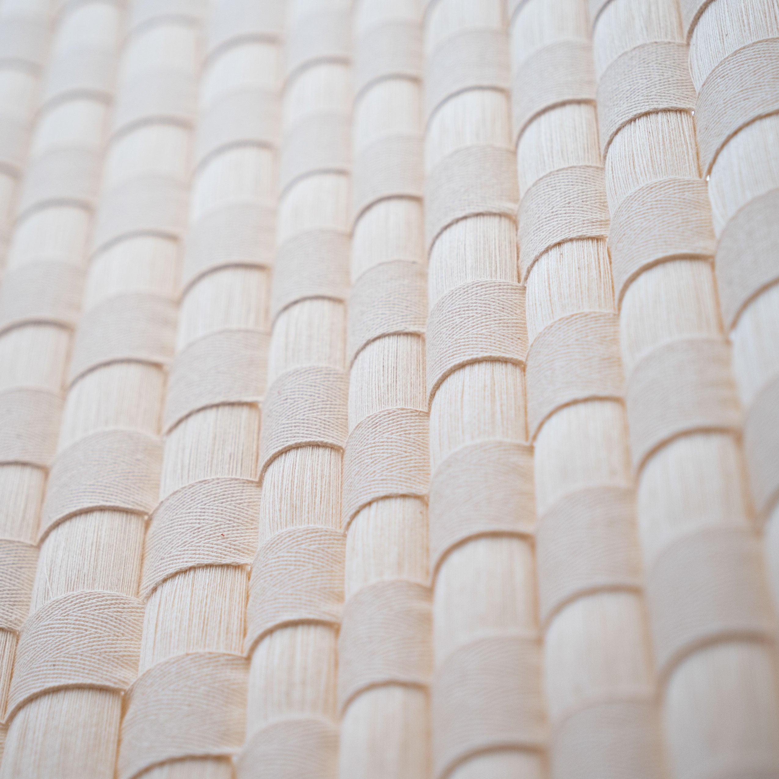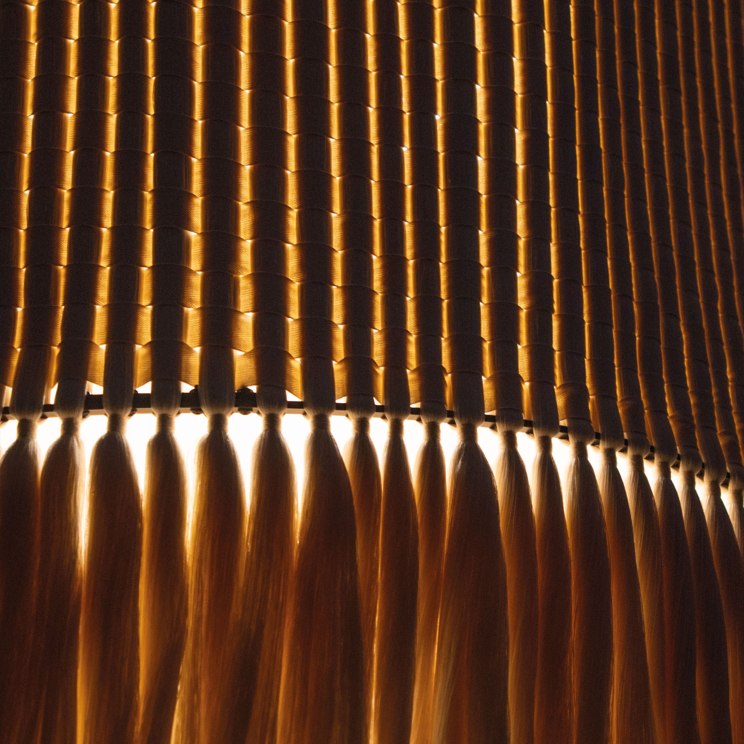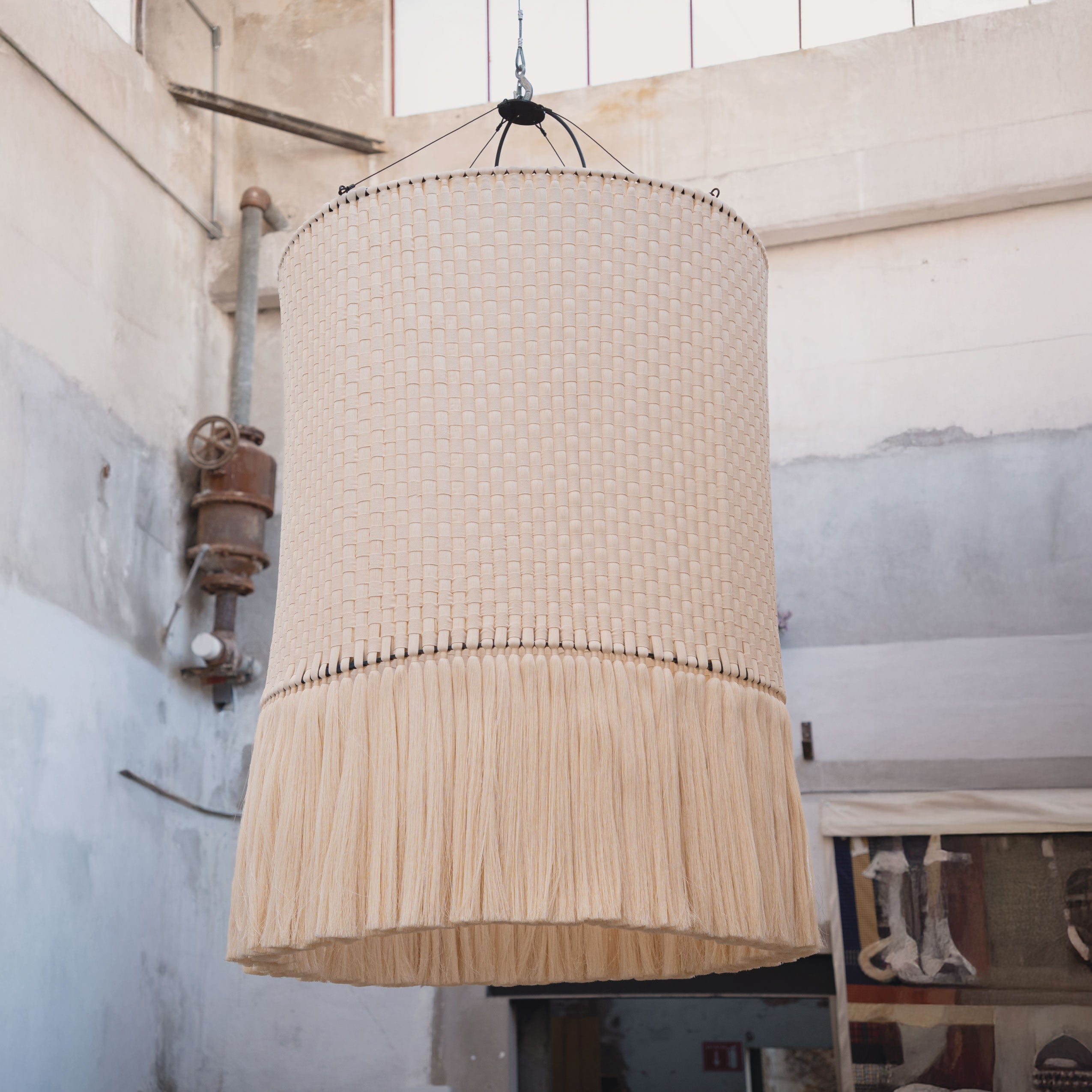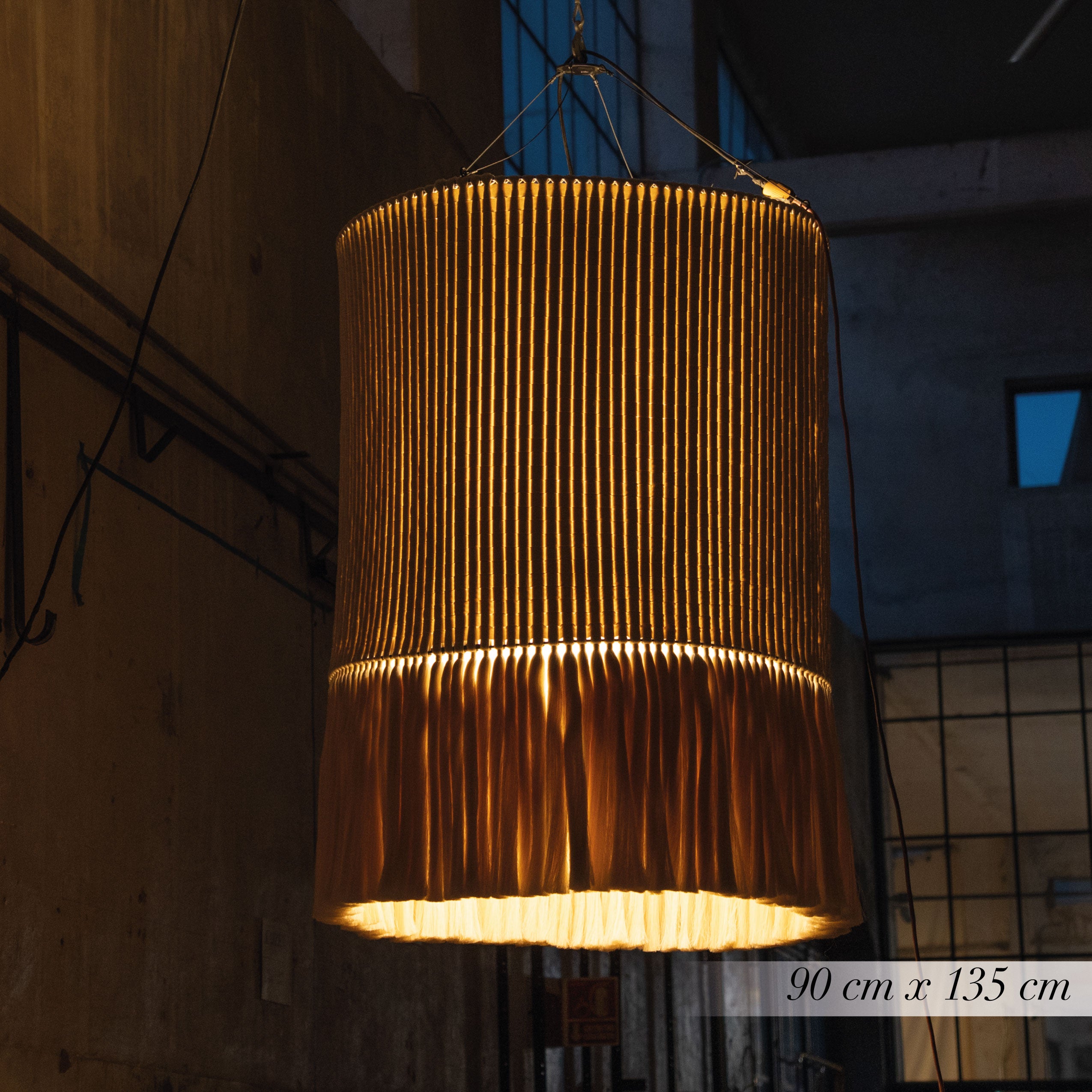 Al jugar con el tejido y la caída de hilo suelto en la parte inferior, generamos un contraste entre dos texturas. Esta transición permite que la luz se filtre de maneras distintas, creando una luminaria llena de siluetas, sombras y formas de interpretar la luz.