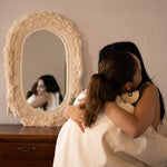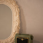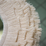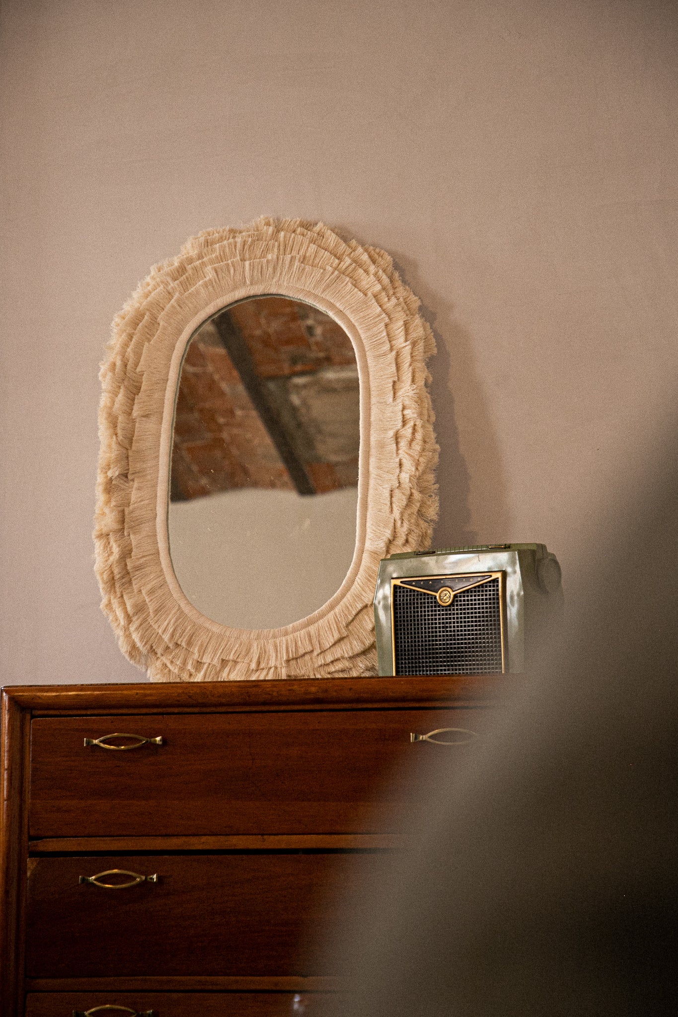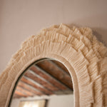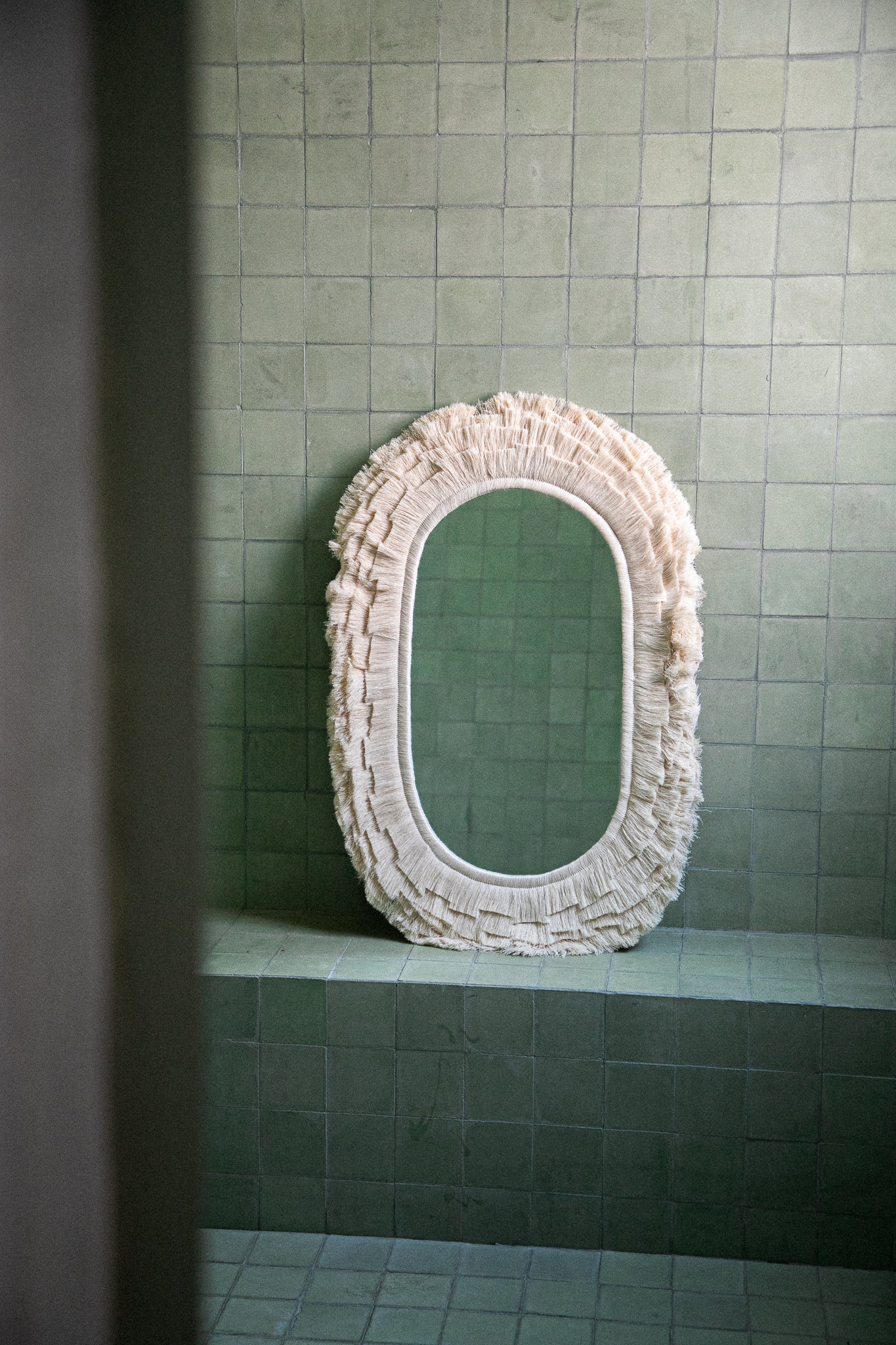 Este espejo está hecho con nuestra técnica de Recuperado; las crines de hilo de algodón crudo, cosidas y ensambladas, son recortadas en sus extremos creando un patrón irregular que realza el volumen de la pieza.