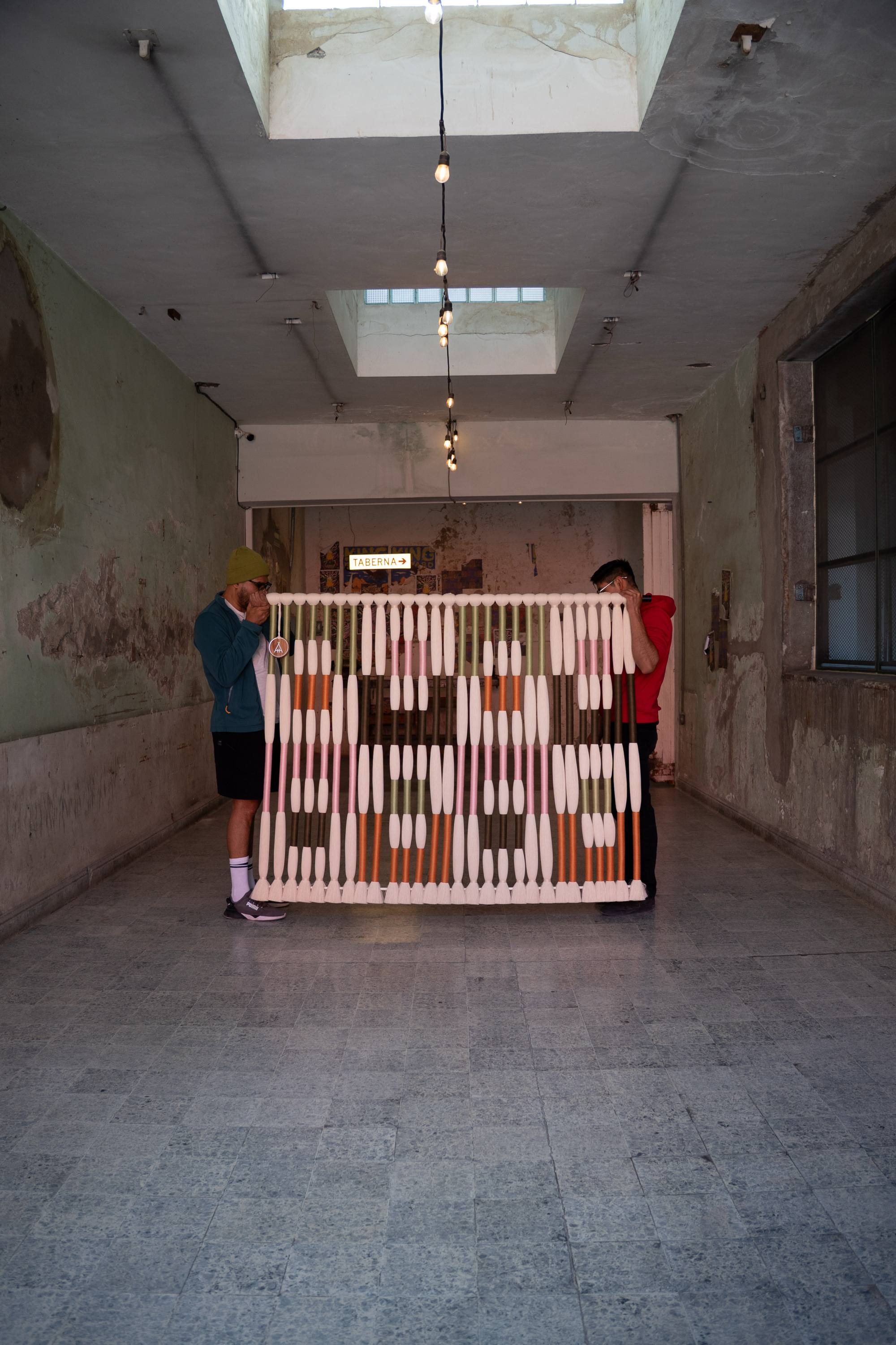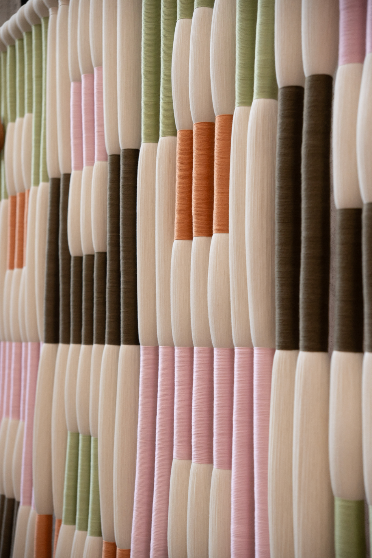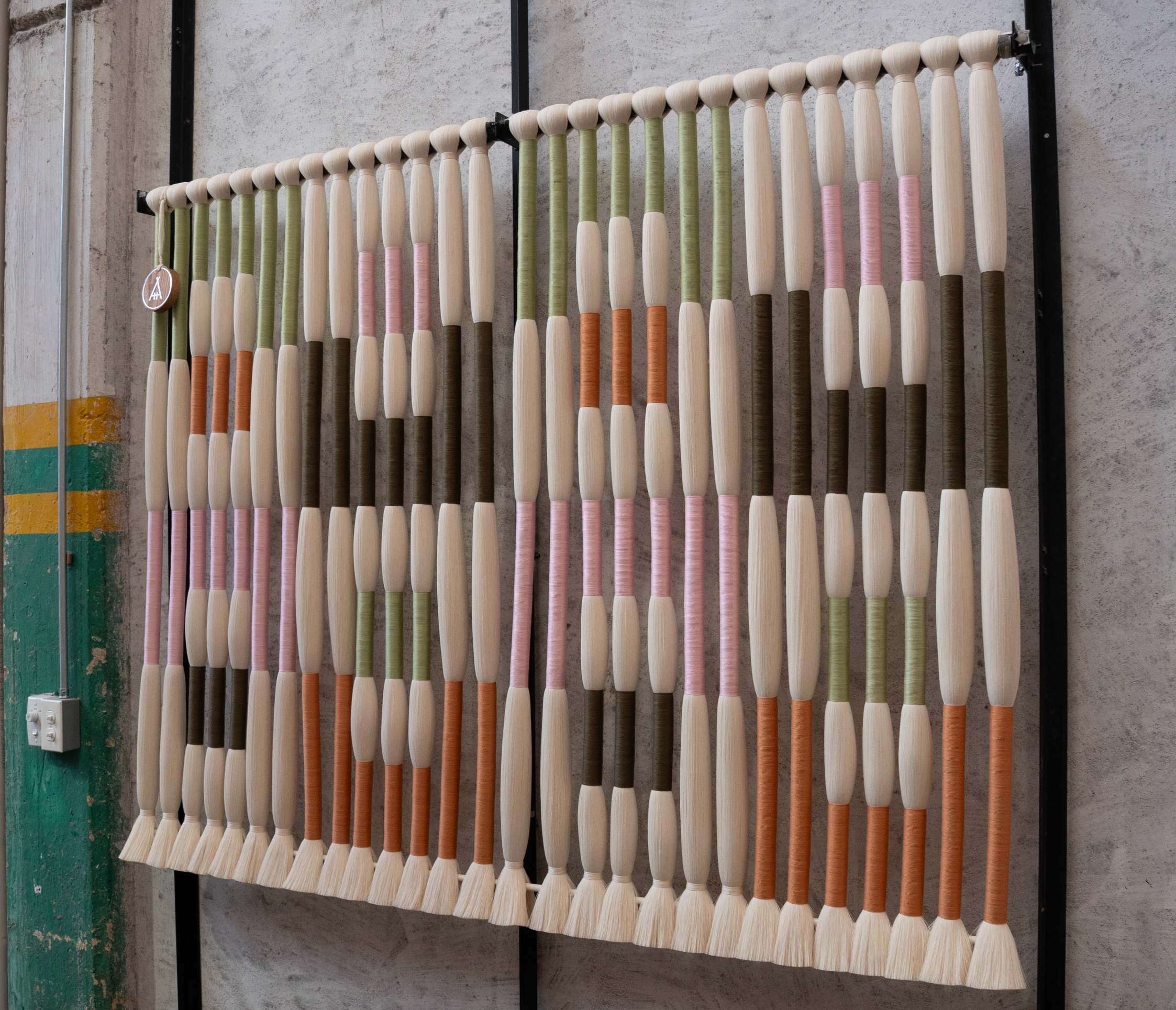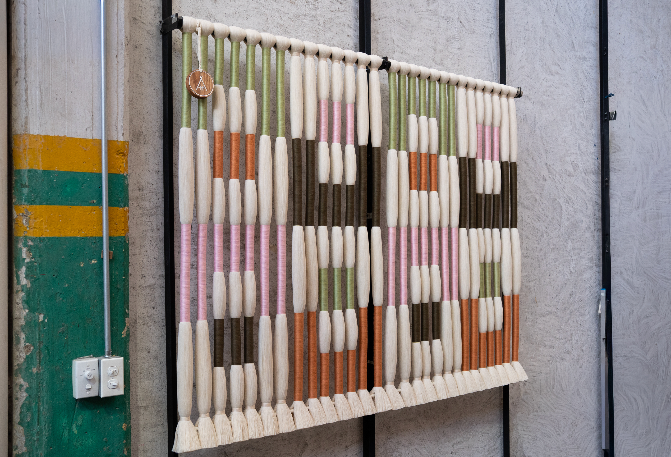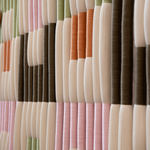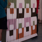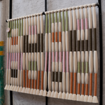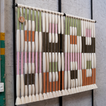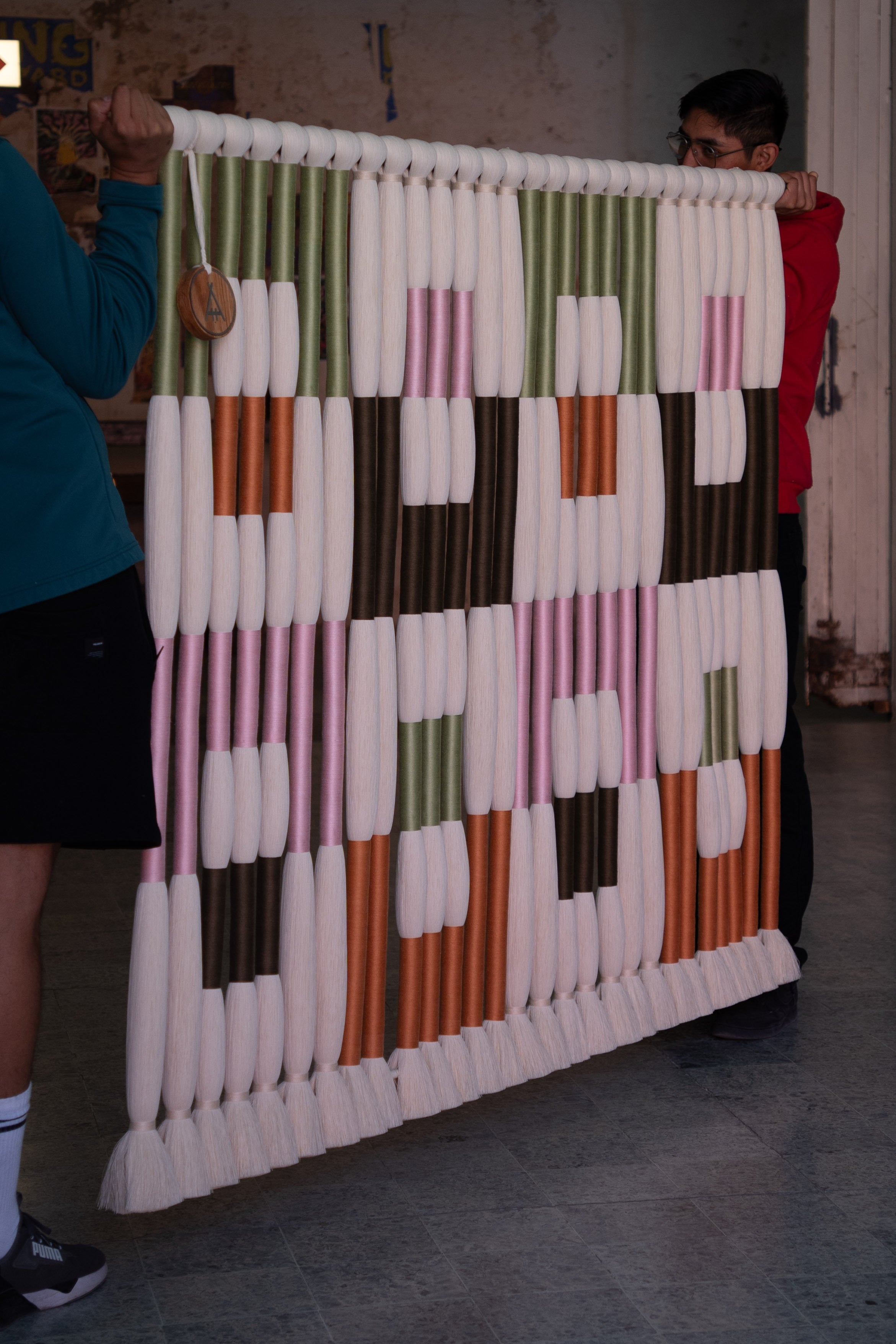 A partir de una retícula formada por amarres de color y espacios blancos de algodón, esta pieza se construye sobre un patrón geométrico que resalta la belleza de la simpleza. Los tonos verde olivo, rosa y naranja aportan contraste y vitalidad, dando vida a Retícula.