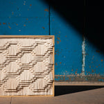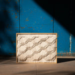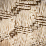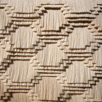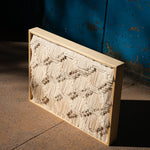 Pieza diseñada para acentuar mesas y paredes. Al interior de un marco de madera de pino certificada, se exhibe un textil rectangular de manta; montadas a este, crines de algodón crudo de nuestra técnica de Recuperado en las que se muestra la habilidad y el dominio artesanal de la técnica del recorte con forma de grecas; representación de la escritura pictográfica de las antiguas culturas mixteca y zapoteca, que durante siglos habitaron el valle de Oaxaca.