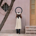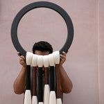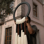 Una reminiscencia de la divinidad primigenia. Majestuosa e imponente pieza, tal y como la figura mitológica que su nombre evoca. Compuesta por seis hileras de algodón crudo sujetas a un aro de madera con acabado natural o negro; los amarres en tonos oscuros remiten a la profundidad que simboliza Saturno/Cronos; enseguida, al igual que el tiempo y la vida, viene la infinita caída del hilo de algodón en mechones recortados. Un acento decorativo para pared hecho para impresionar no sólo por su diseño, sino por la precisión del trabajo hecho a mano por artesanos queretanos en el taller.