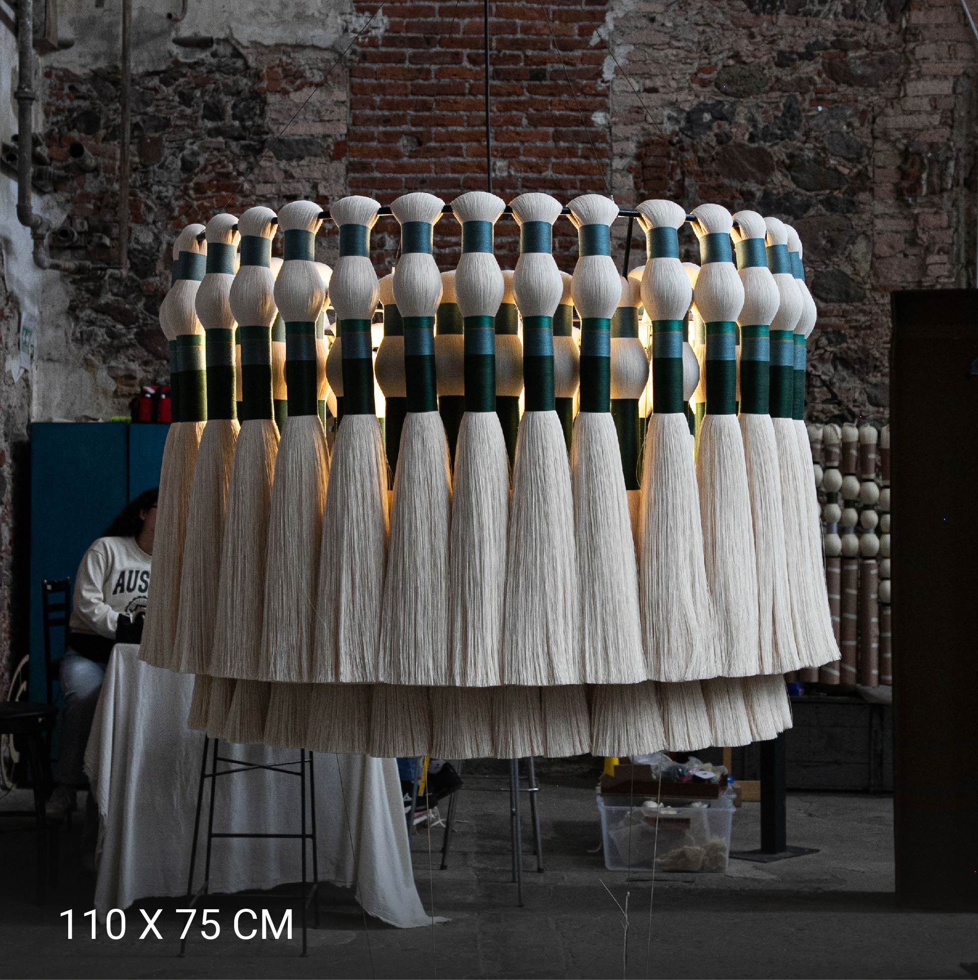 El Son Prehispánico transformado en una pieza funcional y dinámica. Compuesto por dos telares entrelazados que juegan con la luz. La parte inferior produce un segundo patrón que pinta y atenúa la iluminación en tu espacio. Esta obra juega con los colores, las sombras y destellos producidos por los cortes en el algodón.